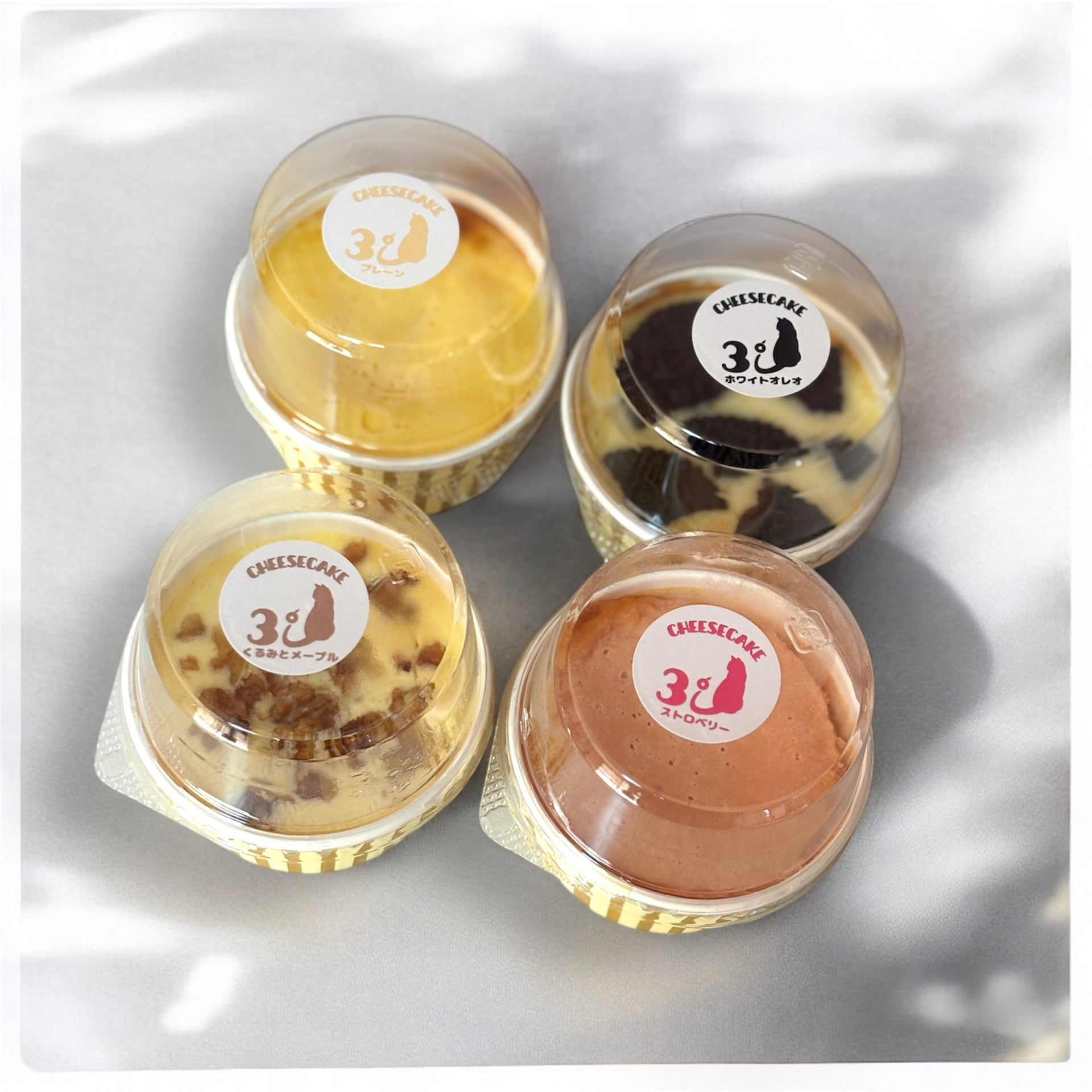 CHEESE CAKE 3℃の4種のカップチーズケーキを詰め合わせました。『とろけるプレーンチーズ×1』、『ホワイトオレオチーズ×1』、『くるみとメープルチーズ×1』、『ホワイトストロベリー×1』